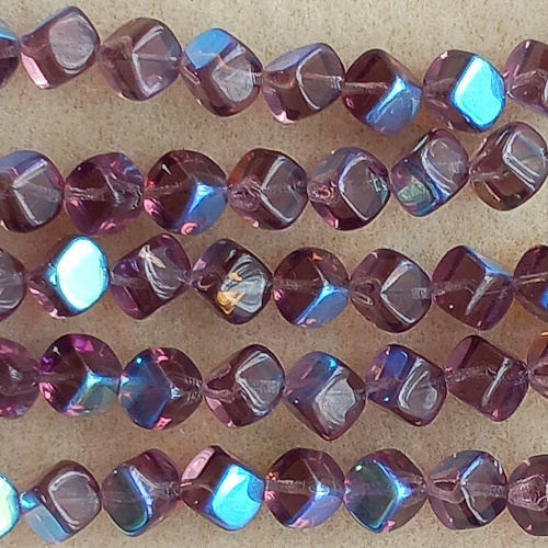 Purple amethyst colour, with a shiny silvery ab coating on one side.
