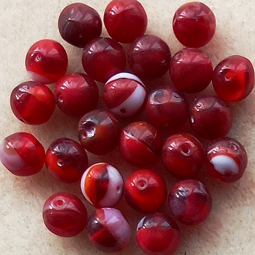 Patterned beads in shades of red.
