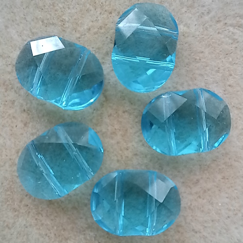 5 flat oval, 2 hole faceted crystal beads, 15mm x 11mm, aqua blue