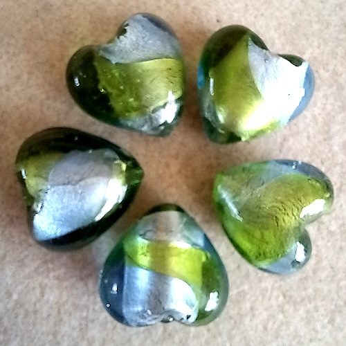 Pack of 5 heart shaped Indian glass beads.
